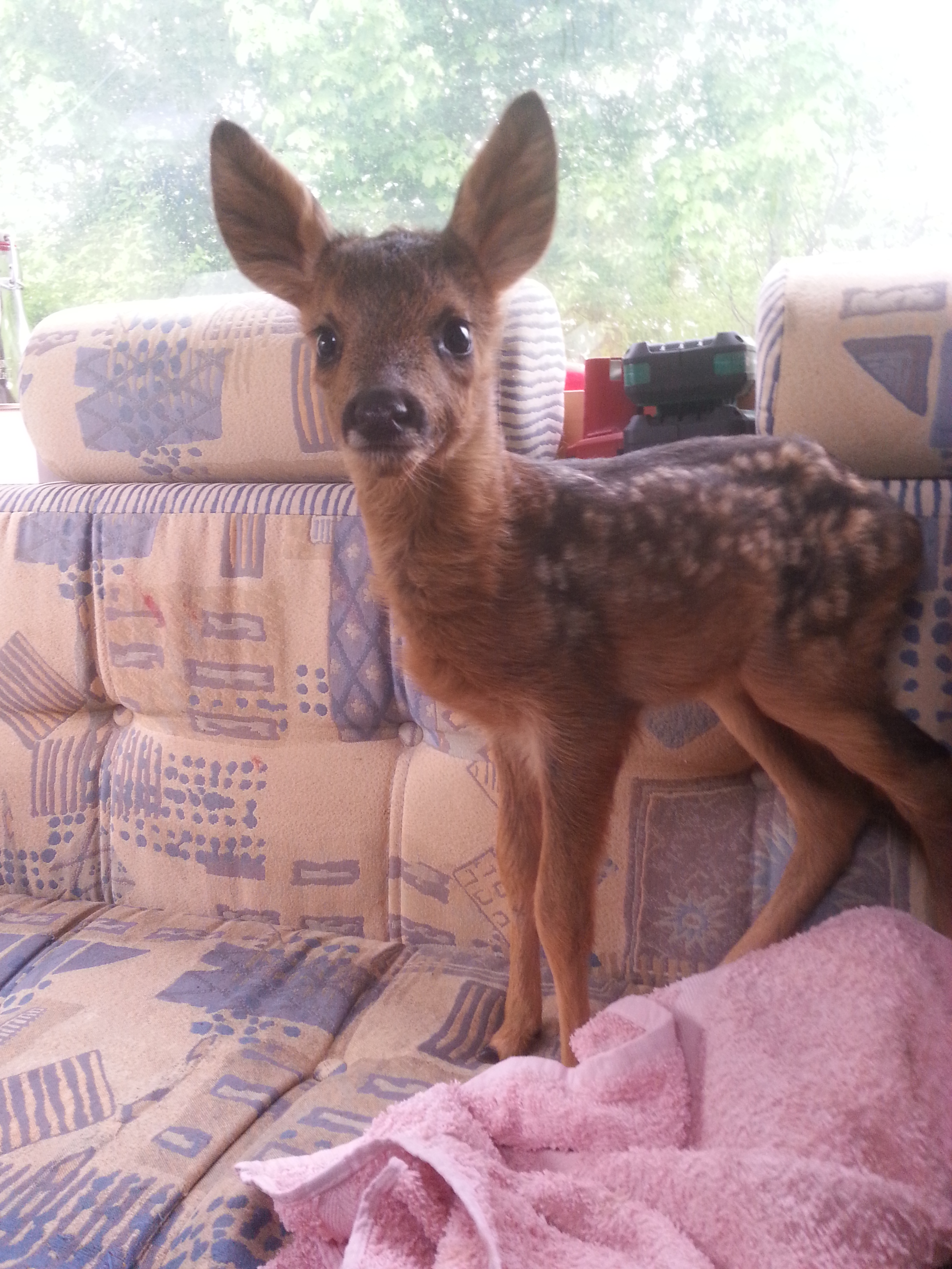 Ich wurde verständigt, nachdem die Helfer das Kitz bereits mit nach Hause genommen hatten. Das Kitz war sehr dünn, dehydriert, geschätzt ca. 10 Tage alt und da es bereits kurz vor Einbruch der Dunkelheit war, hätte es in freier Natur sehr schlechte Chancen gehabt.